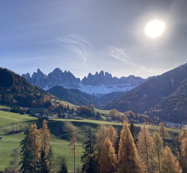 Het dorpje kijkt uit op de Geislergruppe, een spectaculair massief Dolomietenpieken. Naakt, zoals meestal.