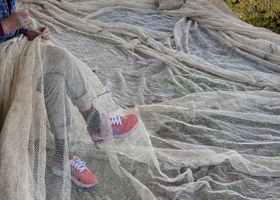 Daarna spreiden we het net weer uit, rondom de boom. Plukpluk. Het is november, maar het weer is prachtig. Sterker, we horen ‘Zzzzzz…’